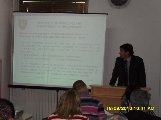 На 22 и на 23 септември 2010 во просториите на Дирекцијата за безбедност на класифицирани информации се одржa Семинар на тема ,,Класифицирани тендери за набавка на класифицирани стоки и услуги, класифицирани договори и безбедносни сертификати за правни лица“. На Семинарот учествуваа вкупно 40 лица, од коишто 18 – претставници од органи на државната управа и 22 – претставници од приватни компании коишто имаат потреба за пристап до класифицирани информации во доменот на индустриската безбедност. Во текот на Семинарот од страна на претставниците на државните органи и на приватните компании беа покренати повеќе прашања сврзани со темата на Семинарот, при што од страна на Дирекцијата беа дадени детални насоки за постапување во одредени постапки за класифицирани набавки. |